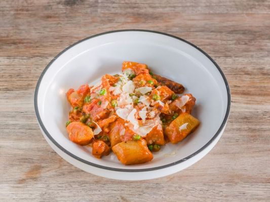 Green peas, pancetta, tomato sugo, sage, Grana Padano