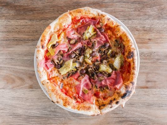 San Marzano Tomato Sugo, Fior Di Latte, Ham, Mushroom, Artichokes, Ligurian Olives.
