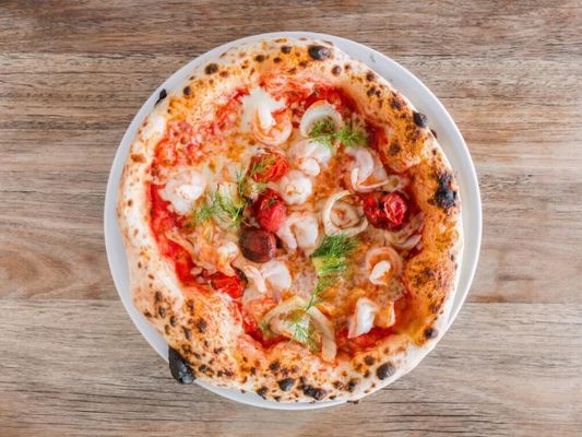 San Marzano Tomato Sugo, Fior De Latte, Tiger Prawns, Cherry Tomatoes, chilli , oregano , garlic oil