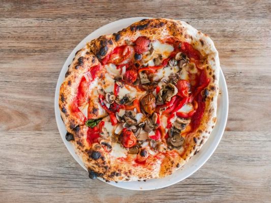 San Marzano Tomato Sugo, Fior Di Latte, Roasted Eggplant, Onions, Zucchini, Scamorza, Roasted Bell Peppers, Cherry Tomatoes